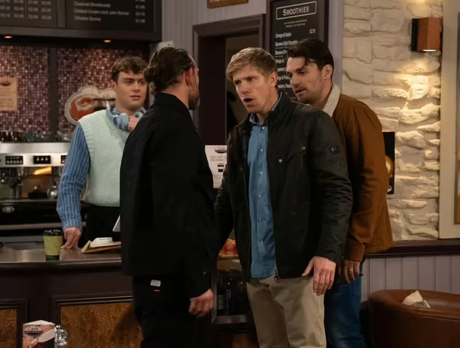 Meanwhile, Kev Townsend (Christopher Coghill) finds himself in a scuffle with Mack Boyd (Lawrence Robb) over a spilt cup of coffee, all the while maintaining his lie about his “impending death” to keep Robert Sugden (Ryan Hawley) close.
